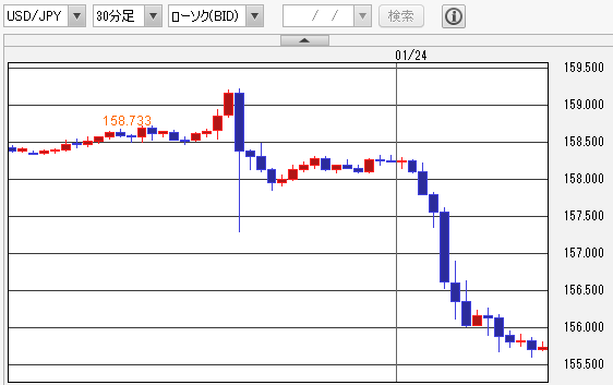 日銀総裁会見中に159.224まで上昇も介入/レートチェックの思惑で155.611まで反落