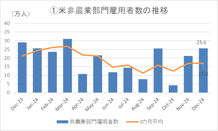 12月の非農業部門雇用者数は前月比25.6万人増と市場予想の16.5万人増を上回った。前月の修正値(21.2万人増)から予想外の増加幅拡大となった。雇用情勢の基調を判断する上で重要視される3カ月平均の増加幅は前月時点から横ばいの17.0万人となった。なお、2024年通年の雇用者の増加幅は223.2万人となり、2023年の301.3万人から鈍化した。