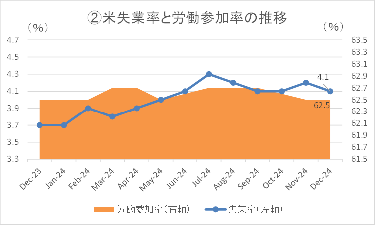 12月の失業率は4.1%と前月の4.2%から低下。市場予想は4.2%だった。フルタイムの職を希望しながらパート就業している人などを含めた広義の失業率である不完全雇用率(U-6失業率)も7.5%と前月の7.7%から低下した。労働力人口に占める働く意欲を持つ人の割合である労働参加率は62.5%と市場予想通りに前月から横ばいだった。なお、2024年の平均失業率は4.03%で、2023年の3.63%から上昇した。
